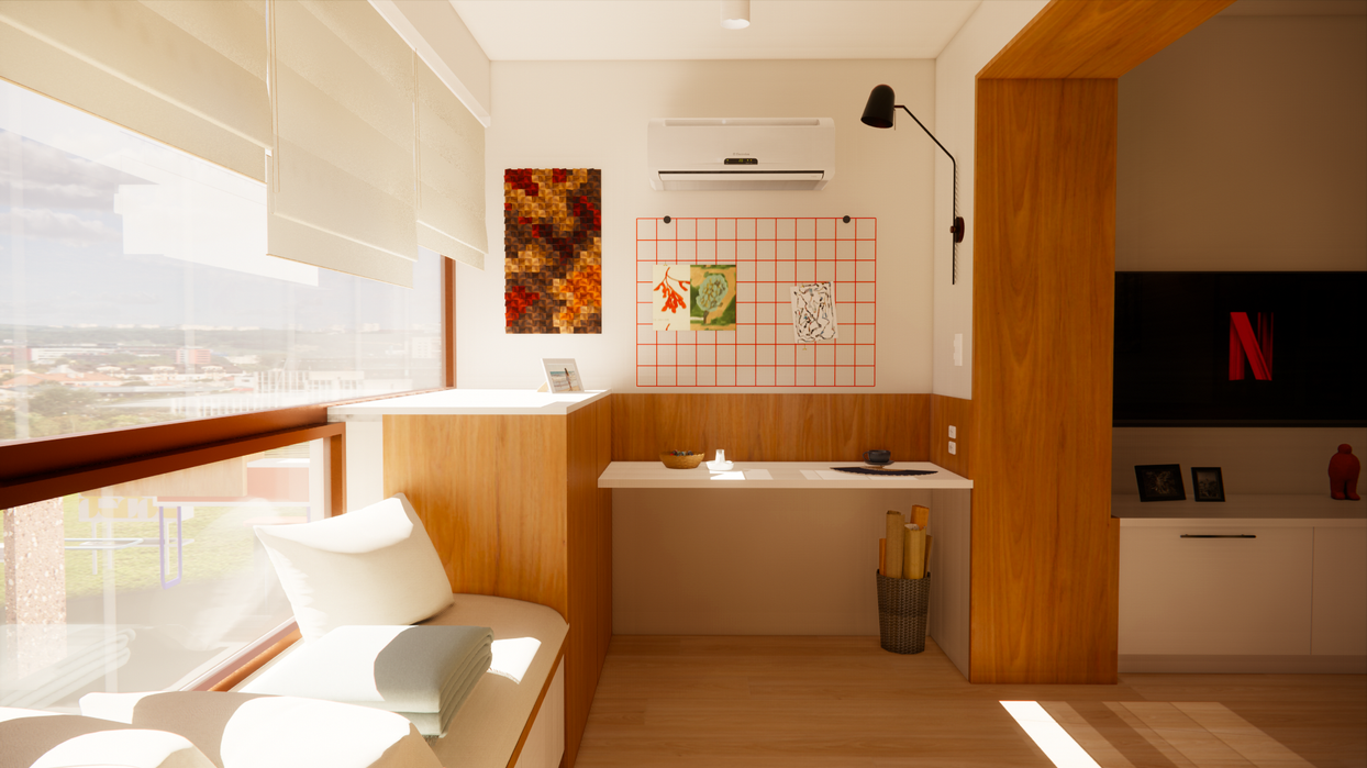 Residência de uma artista plástica, com obras vibrantes marcadas por folclore e memória, o apartamento se tornou uma extensão do ateliê e da própria identidade da moradora. Assim, o projeto se propõe como coadjuvante: uma arquitetura de fundo, silenciosa, que dá lugar à expressão da arte.
